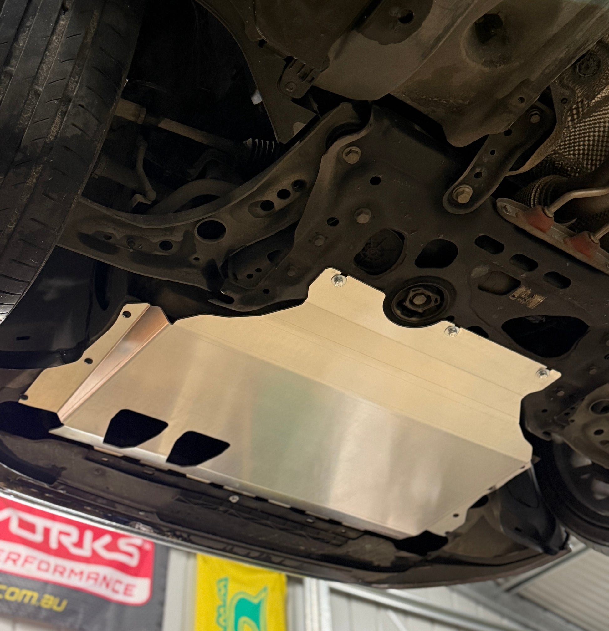 Precision cut from 3mm aluminium, this skid plate shields your oil pan, subframe and critical undercarriage components from road and track debris and abuse.